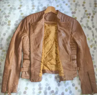 Chaqueta de piel de color marrón. - Cuello redondo con cierre de botón. - Bolsillos laterales con cremallera. - Puños y cintura elásticos. - La talla es XL pero talla un poco pequeña como L - Medidas: Hombros 46, Largo 65, Pecho 53 cm