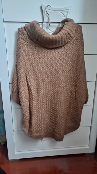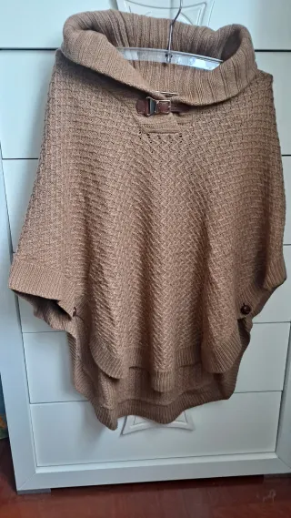 Elegante poncho de punto de la marca Massimo Dutti. - Diseño con cuello alto y detalle de hebilla. - Tejido texturizado con rombos. - Aberturas laterales con botones. - Acabado con volantes en capas.