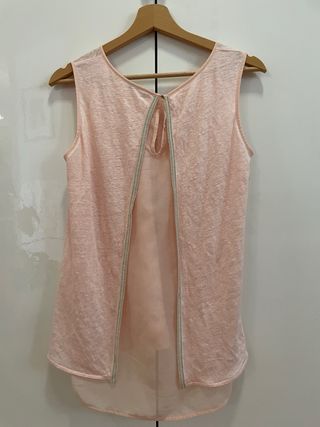 un top con el detalle brillantitos en espalda y el tejido tiene una textura suave en color rosa.