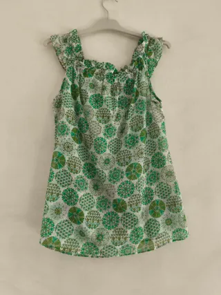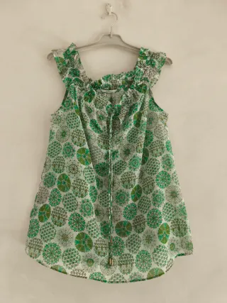 Precioso top de Massimo Dutti con un estampado floral en tonos verdes y blanco. Es una prenda ligera y fresca, ideal para el día a día. - Escote con volantes y cordón. - Mangas cortas con volantes. - Estampado de motivos circulares.