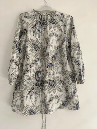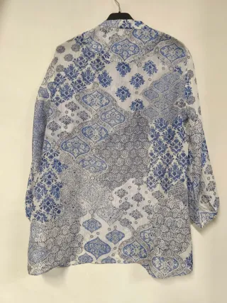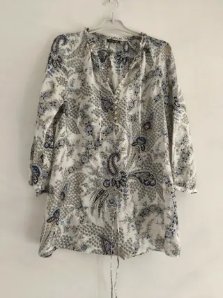 Camisa de Massimo Dutti con un bonito estampado. - Diseño con cuello de pico y cordones. - Mangas largas. - Estampado floral y paisley en tonos azules y grises sobre fondo blanco.