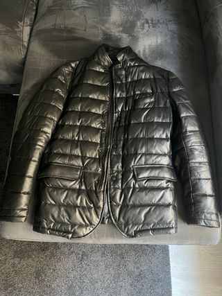 Chaqueta de piel de Massimo Dutti. - Diseño acolchado. - Cuello redondo. - Cierre de cremallera y botones a presión. - Bolsillos frontales. Como nueva, tiene un minimo arañazo en la manga izquierda imperceptible.