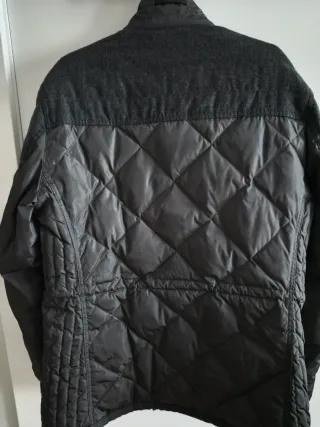 Cazadora de la marca Massimo Dutti en color gris. Presenta un diseño acolchado con detalles en tejido de espiga. - Cierre de cremallera y botones. - Cuello alto. - Bolsillos frontales con solapa. -Tambien bolsillos laterales Estado impecable.