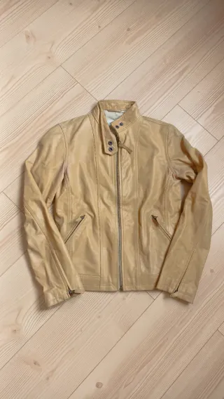 Chaqueta de piel caprina para mujer, talla S. - Chaqueta de estilo motero color crema, con ceñidores de hebilla en la cintura, cremalleras en los puños y en los bolsillos laterales. Cierre frontal de cremallera. - Con marcas del uso, en buen estado.