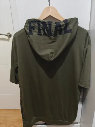 Sudadera de color verde militar con capucha y detalle de cremallera,letras laterales y en gorro. Manga corta tipo camiseta - Diseño con capucha. - Cremallera frontal. - Bolsillo canguro. Manga corta