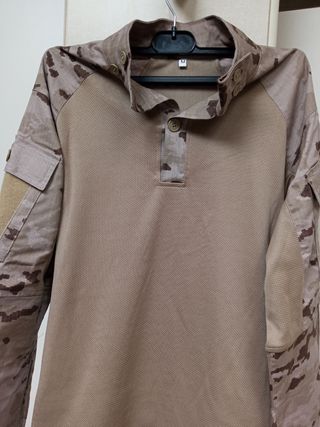 Camiseta técnica de estilo militar con estampado de camuflaje. Ideal para actividades al aire libre. - Mangas largas con diseño de camuflaje. - Cuello con botones. - Bolsillos en las mangas.negociable