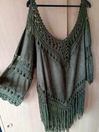 PONCHO serraje verde militar. Detalles de flecos y ganchillo. Rollo ibicenco. Queda chulísimo con unos shorts y unas cuñas. Vale para S y M. Una sola puesta.