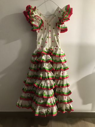 Precioso vestido de sevillana para niña, ideal para cualquier evento. Es de color blanco con lunares rosas y verdes. - Perfecto para niñas de entre 13 y 15 años. - Talla 6. - Diseño con volantes y lunares. Ideal para romerias y ferias