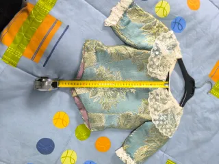Precioso traje tradicional de Alicantina, ideal para niña/adolescente de unos 13/14 años. Conjunto de corpiño y falda - Diseño floral vibrante sobre fondo azul. - Tejido con acabado satinado y detalles dorados. - Cintura fruncida para un ajuste cómodo.