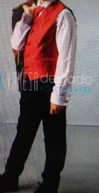 Elegante traje de comunión para niño, con detalles en dorado. - Chaqueta con hombreras y galones dorados. - Chaleco a juego. - Cordón dorado decorativo.viene con chaleco y camisa blanca talla 8 para niños muy delgaditos