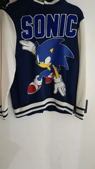 Chaqueta de niño con diseño de Sonic. - Mangas blancas. - Cuerpo azul marino. - Puños y cuello con rayas. - Estampado de Sonic en el frontal.