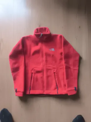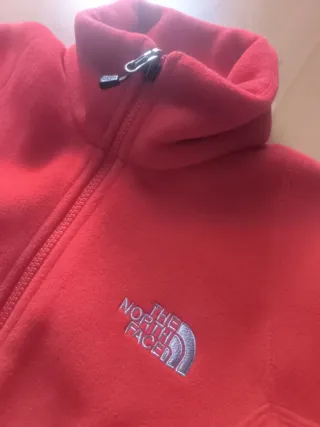 Forro polar de la marca The North Face en un llamativo color rojo para mujer/niña talla xs. Es una prenda cómoda y versátil. - Cierre completo con cremallera. - Dos bolsillos laterales con cremallera. - Cuello medio/alto para mayor protección. - proteje muy bien del frío.