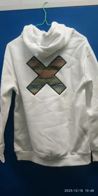 Sudadera con un diseño gráfico en el pecho. Talla S ideal para niños de 12 años con su etiqueta - Diseño de X con detalles de colores. - Texto blue banana debajo del diseño.nueva a estrenar