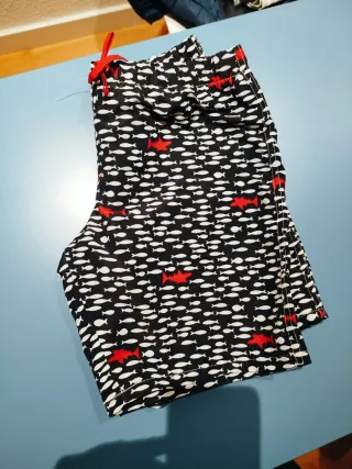 Bañador infantil con un divertido estampado de peces y tiburones. Buen estado, talla 12 años. - Diseño llamativo en fondo negro. - Detalle de cordón rojo en la cintura.