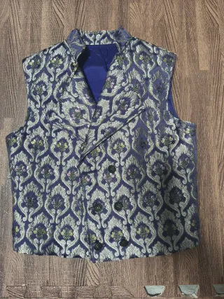 Chaleco de estilo fallero para niño, adecuado para edades de 8 a 10 años, según el niño podría variar la edad. Presenta un diseño llamativo con estampado floral en tonos rosas/morados y detalles dorados. - Estampado floral vibrante. - Botones dorados. - Cuello solapa. Es de la reconocoda tienda Llorca, muy buena calidad