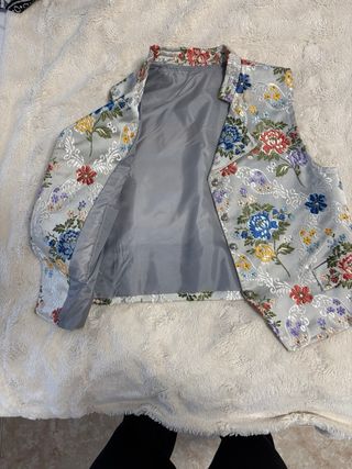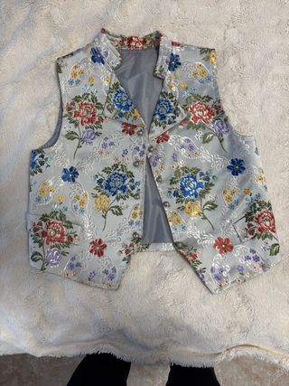 Chaleco con un diseño floral vibrante y detalles plateados. Ideal para celebraciones. - Estampado floral detallado. - Cierre con botones. - Cuello estilo solapa.