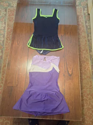 Dos trajes de gimnasia rítmica para niña. - Uno de color azul marino con detalles arcoíris en el cuello y mangas. - Otro de color rosa palo con falda. - Ideal para entrenamientos o competiciones. Precio por unidad..