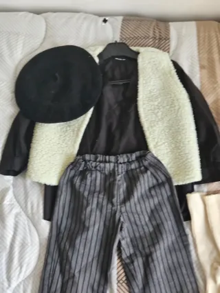 Conjunto de ropa para niños, ideal para disfraces o juegos. - Incluye chaleco de borreguito. - Pantalón de rayas grises. - Camisa negra. - Boina negra.
