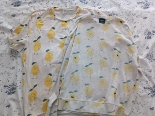 Conjunto de ropa para familia con un divertido estampado de limones. - Diseño alegre y colorido. - Tejido suave y cómodo. Camiseta manga corta XL, jersey talla M. Vendo también conjunto para bebe. Hemos utilizado para una sesión de fotos