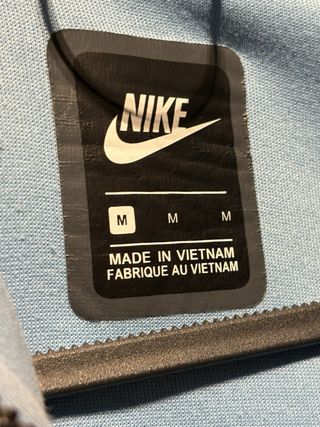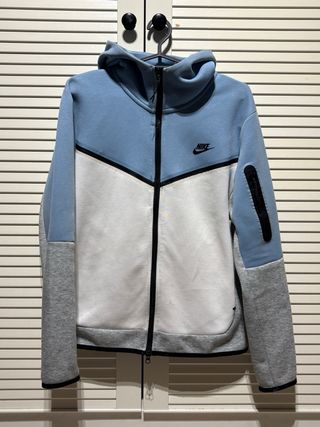 Sudadera con capucha Nike Tech Fleece en un llamativo color azul bebé. Presenta un diseño moderno con paneles en contraste y el icónico logo de Nike. - Paneles en color blanco y gris. - Cremallera frontal completa. - Bolsillo con cremallera en la manga.