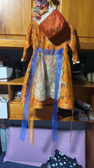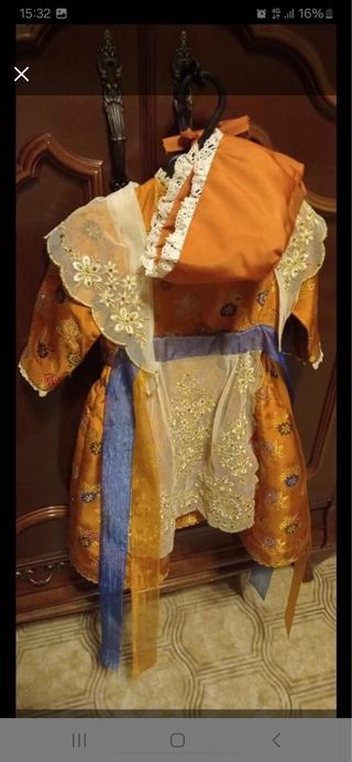 Traje de fallera para bebé, ideal para alquilar. - Diseño tradicional. - Tejido con detalles dorados y naranjas. - Incluye varios complementos. - TODA LA SEMANA FALLERA POR 70€.