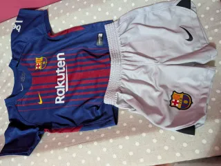 Conjunto de equipación del FC Barcelona para bebé de 9-12 meses. - Camiseta azul y granate con detalles. - Pantalón corto gris. - Escudo del club en ambas prendas. - Logo de Nike.
