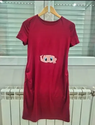 Vestido premamá con un divertido estampado de un bebé asomando. - Diseño original y alegre. - Tejido suave y cómodo.