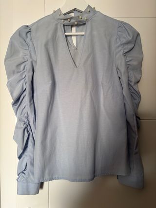 Elegante blusa de manga larga con detalles de perlas en el cuello y volantes. - Cuello alto con adornos de perlas. - Escote en forma de pico. - Mangas abullonadas con fruncido. - Puños abotonados.