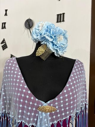 Vestido buganvilla con flor y mantoncillo azul bebé Vestido elástico de licra Talla S/M Nuevo con etiqueta El precio incluye mantoncillo broche peina y flor El broche y peina se pueden cambiar por otro modelo a consultar
