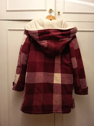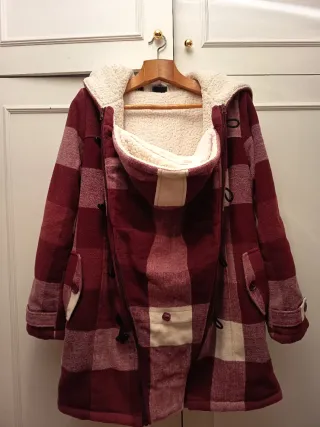 Abrigo premamá con un diseño a cuadros en tonos rojos y beige. Sirve para llevar al bebé también. Es muy cálida. Talla grande. - Forro interior de borreguito. - Cierre con cremallera y botones. - Capucha. - Bolsillos delanteros.