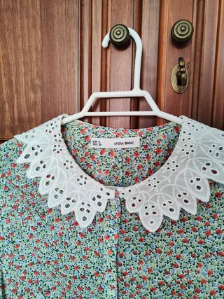 Blusa con cuello bebé en blanco. El estampado es con florecillas pequeñas en tonos verdes, naranjas y azules. Talla S de Sfera. Está como nueva, muy poco uso. De hombro a hombro mide 35cm De axila a axila mide 44cm De largo mide 57cm