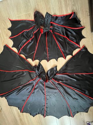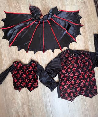 Conjunto de disfraz para Halloween o fiestas temáticas. Incluye capa de murciélago esta buen estado y dos chalecos un poco viejo El pantalones solo queda de adulto , el bebe se ha perdido. 8€ cada, y 15€ para los dos trajes. Bebe es para 1-2 años. - Capa con alas de murciélago y detalles rojos. - Chaleco con estampado de calaveras rojas. - Tallas variadas para niño y adulto.