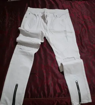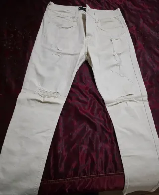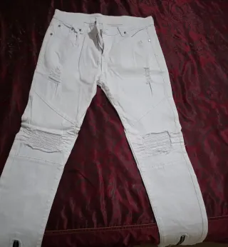 Pantalón de corte moderno en color blanco. - Diseño con cremalleras en los tobillos. - Detalles desgarrados en las rodillas. - Costuras reforzadas.