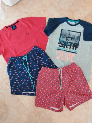 Lote de 4 prendas de ropa de verano para hombre, ideal para días de sol y playa. Incluye dos camisetas y dos bañadores. - Camiseta roja serigrafiada por detrás y con logotipo de la marca bordado por delante. Marca Ridebike. La camiseta pone talla L, pero es pequeña como una talla S - Camiseta gris y azul marino con estampado de skate y texto. Talla 16 equivalente a la talla S. - bañador azul con estampado de sandías Springfield, talla S - bañador rojo con estampado geométrico Springfield, talla S Lote completo 15€, por separado: camiseta roja 7€, resto prendas 4€ cada una. Hago envíos a partir de 5€.