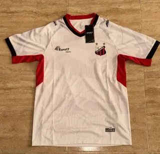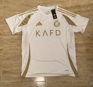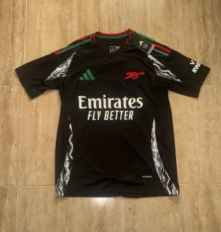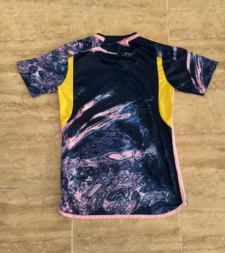 Camiseta de fútbol con un diseño moderno y llamativo. - Cuello redondo. - Manga corta. - Escudo del equipo bordado. - Logo de la marca visible.