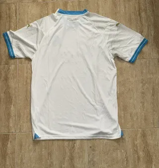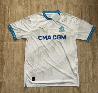 Camiseta de fútbol del Olympique de Marseille, temporada 2023-2024. - Diseño blanco con detalles en azul y dorado. - Logo de Puma y escudo del club. - Patrocinador CMA CGM en el frontal.