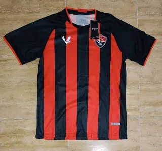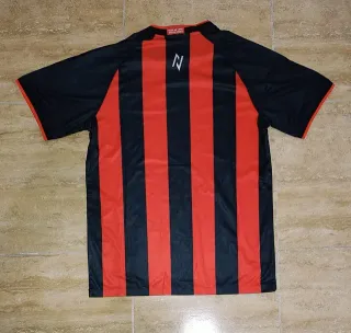 Camiseta de fútbol con diseño de rayas verticales. - Diseño de rayas rojas y negras. - Logo de la marca Volt en blanco. - Escudo del equipo en el pecho.
