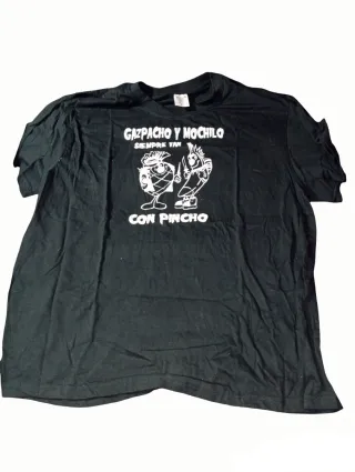Camiseta con estampado divertido. - Diseño Gazpacho y Mochilo - Estampado blanco sobre fondo negro.