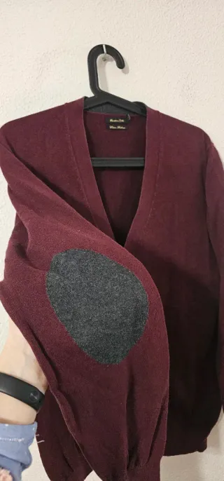Cardigan de punto de la marca Massimo Dutti en color morado. Presenta un diseño clásico con botones frontales y coderas. Talla XL da talla para L - Cierre de botones. - Cuello en V. - Coderas de ante. - Puños y bajo de canalé.