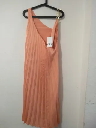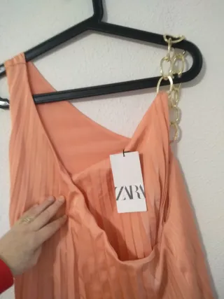 Vestido de la marca Zara con un diseño elegante y moderno. - Diseño plisado. - Detalle de cadena en el hombro. - Corte asimétrico.