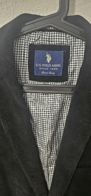 Elegante blazer de pana de la marca U.S. Polo Assn. - Color negro. - Cierre de dos botones. - Bolsillos frontales. - Forro interior a cuadros.