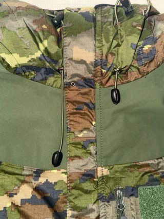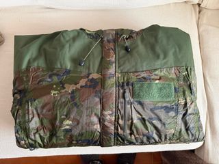Chaqueta de camuflaje diseñada para el frío extremo. - Diseño de camuflaje multicolor. - Parte superior en color verde. - Cremallera frontal. - Bolsillo con velcro en el pecho. Son 120€ ya que el segundo corchete que tiene a la altura del cuello el embellecedor no lo tiene.