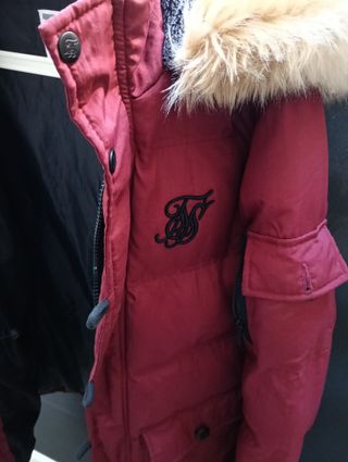 Abrigo acolchado de la marca SikSilk en color rojo. Presenta un diseño moderno y funcional. - Capucha con pelo sintético. - Cierre de cremallera y botones. - Bolsillos frontales con solapa. - Detalle de logo bordado en el pecho. - Bolsillo con cremallera en la manga.