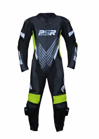 Mono de moto PSR para hombre, con un diseño moderno y detalles llamativos. - Combinación de colores negro y verde. - Logotipo PSR visible en varias partes.