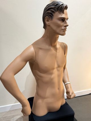 Busto de maniquí masculino con un diseño realista. - Tonos de piel beige y detalles fracciones naturales. - Ideal para exhibición de ropa.