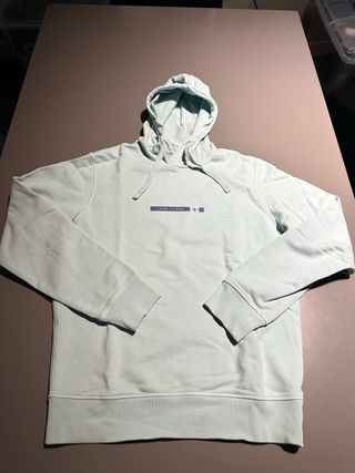 Sudadera de hombre de la marca Stone Island. Talla L. De color turquesa/menta. Aunque tienen unas manchitas abajo en la espalda (foto), Está en muy buen estado!!! - Color verde azulado. - Diseño con logo en el pecho.