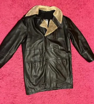 Abrigo tipo chaquetón de color marrón efecto piel ante y borrego interior. Muy calentito y cómodo. Presenta un diseño clásico y elegante. - Cierre de botones. - Bolsillos frontales. - Costuras decorativas.