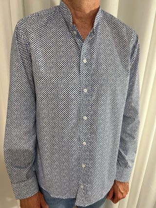 Camisa de manga larga con un estampado geométrico en tonos azules y blancos. Presenta un diseño moderno y casual. - Cuello clásico. - Cierre de botones. - Logo bordado en el pecho.