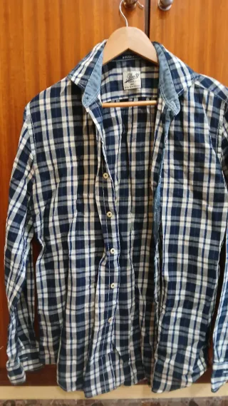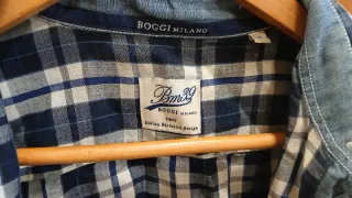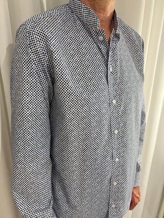 Camisa de manga larga para hombre abotonada, marca Roger, talla L (consultar medidas) en color blanco con pequeño estampado a cuadros en azul. 📏 Medidas: Ancho tripa: 52 cm Largo: 75 cm Manga: 66 cm Confeccionada en poliéster (65%) y algodón (35%) en Valencia, es cómoda, fresca y está nueva, sin estrenar. Ideal para un look elegante y para esta temporada