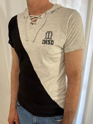 Camiseta talla M de Inside Youth de hombre, color gris y negro, con capucha, cuello en pico y cordones, manga corta. Está en perfecto estado. 📏 Medidas: 66 cm largo 50 cm ancho pecho 🔍 Composición 100% algodón